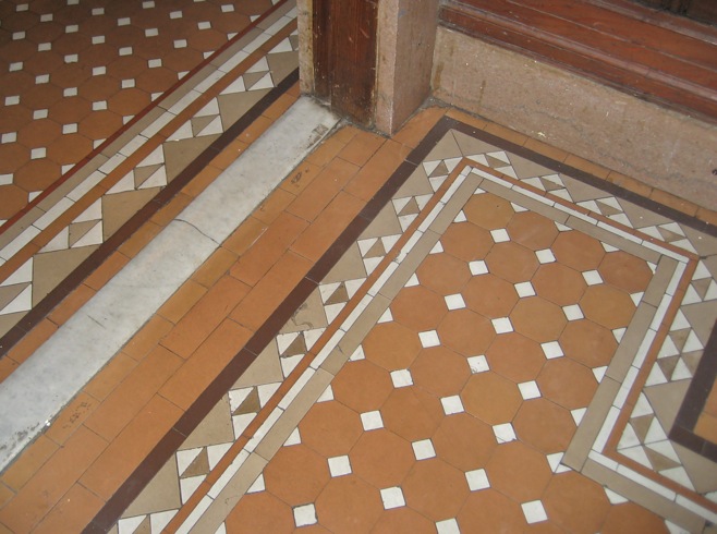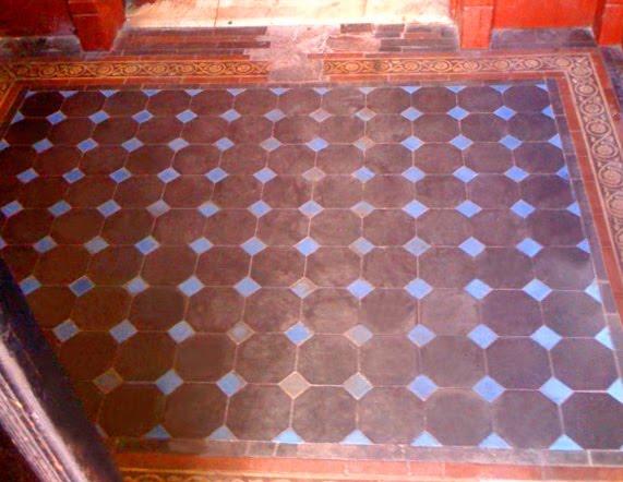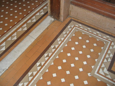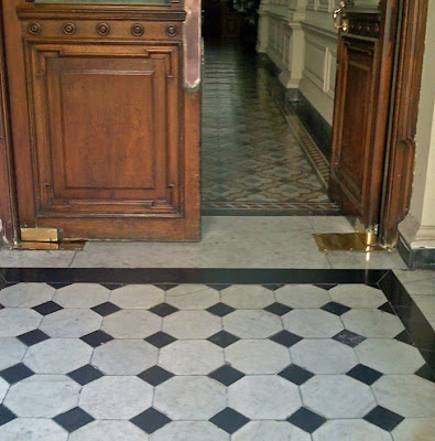 These floor patterns in general are designed like a classic rug with "fill" repetition at the center and a solid or contrasting pattern border around the perimeter. Darker colors probably made more sense for high traffic areas but white and black was the ultimate cleanliness test since dirt was more visible on the lighter floors. Carreaux d'Octagones marble is easy to find at most marble floor showrooms but encaustics are less common. Those looking for encaustic tile patterns and replications should check out Tile Source Inc. which is the major supplier in the U.S. for this traditional look: LINK